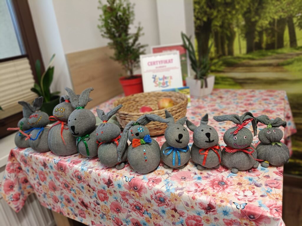Dzieci z ogromnym zaangażowaniem przystąpiły do pracy. Zaczęły od wypełnienia skarpetki ryżem, a następnie formowania z niej kształtu zająca. Nie zabrakło również ozdabiania – pojawiły się kolorowe wstążki, oczka i inne dekoracje, dzięki, którym każdy z zajączków był wyjątkowy i niepowtarzalny.